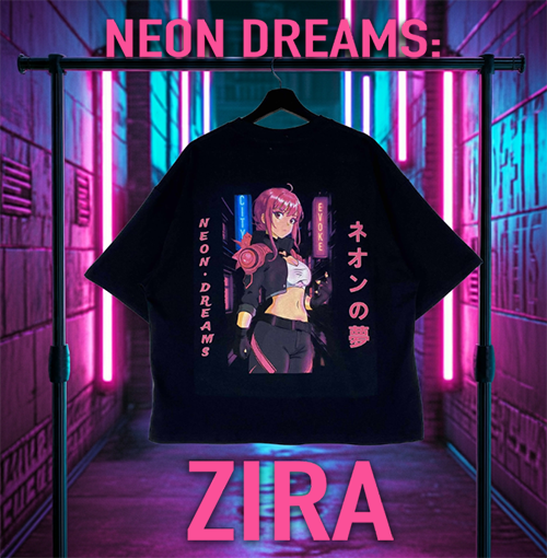 Beneath the neon glow, Zira drifts between dreams and reality.